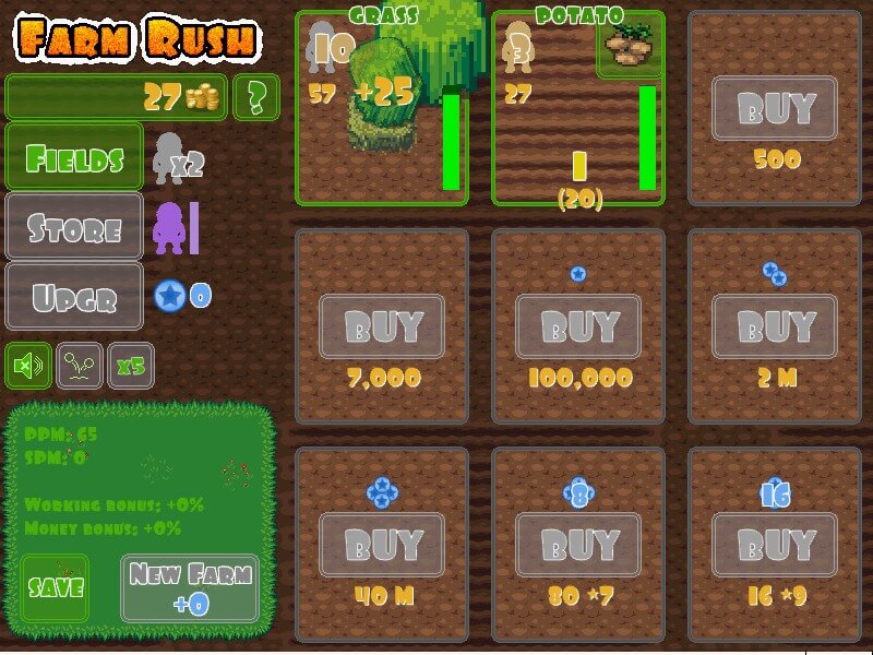 Idle hra, ktorá nestavia len na divoké klikanie. Kúpte pole, zasejte, počkajte až sa urodí, pozbierajte úrodu a získajte peniaze za ktoré sa budete vylepšovať. Ovládanie: myš.